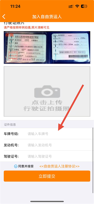 4、在申請頁面填寫車牌號碼、發(fā)動機(jī)號、駕駛證號等信息,上傳行駛證照片,點(diǎn)擊立即提交按鈕。