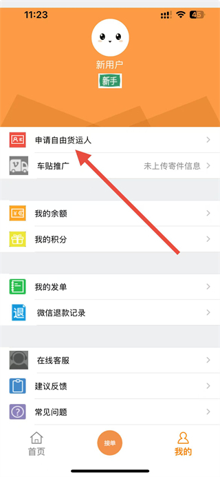 2、在個(gè)人頁面點(diǎn)擊申請自由貨運(yùn)人選項(xiàng),進(jìn)入申請頁面。