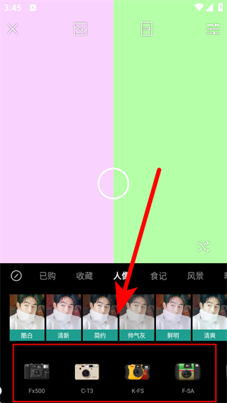 3、在效果頁面,選擇喜歡的相機(jī)效果,如人像風(fēng)格或相機(jī)型號等。