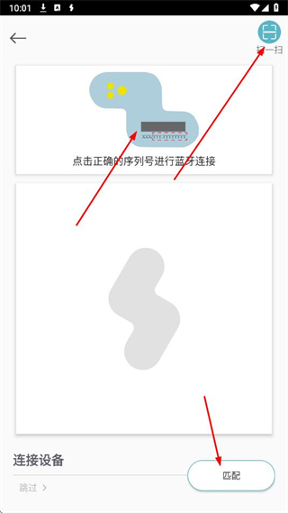 2、進(jìn)入匹配設(shè)備頁面后,可點擊掃一掃掃描設(shè)備上的二維碼,或點擊正確的設(shè)備序列號,點擊匹配進(jìn)行藍(lán)牙連接。