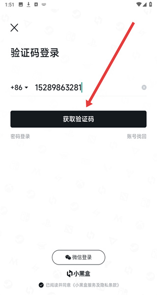 2、在驗證碼登錄頁輸入手機號,點擊“獲取驗證碼”按鈕。