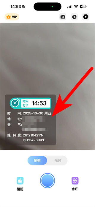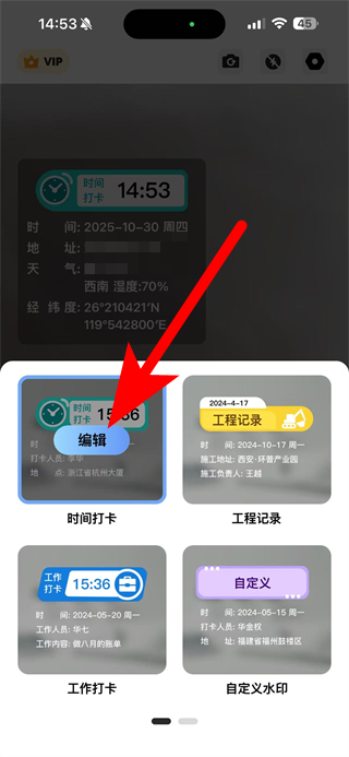 2、在拍攝界面中,點擊水印區(qū)域,進入水印選擇界面,選擇時間打卡水印并點擊編輯。