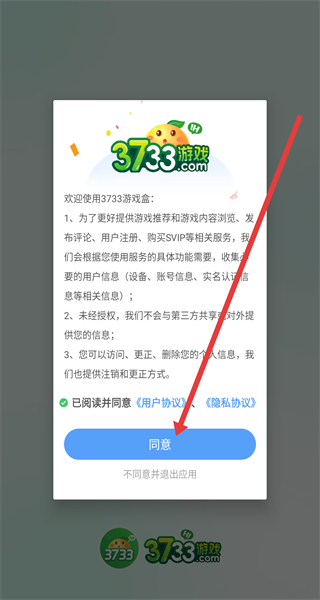 1、點擊“3733游戲盒”用戶協(xié)議彈窗的“同意”,進入主界面。