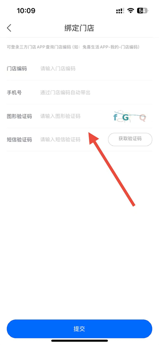 4、在綁定門店頁面輸入門店編碼、圖形驗證碼和短信驗證碼后點擊提交按鈕,完成門店綁定。