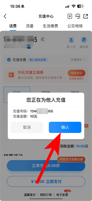 4、在彈出的確認(rèn)框中,核對(duì)充值號(hào)碼和金額后點(diǎn)擊確認(rèn),完成話(huà)費(fèi)充值。