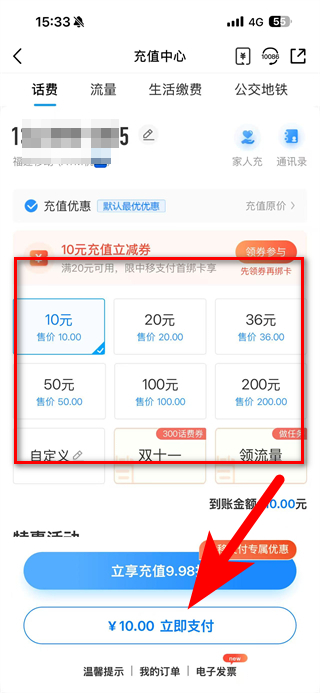 3、選擇充值金額如10元,點(diǎn)擊立即支付按鈕。