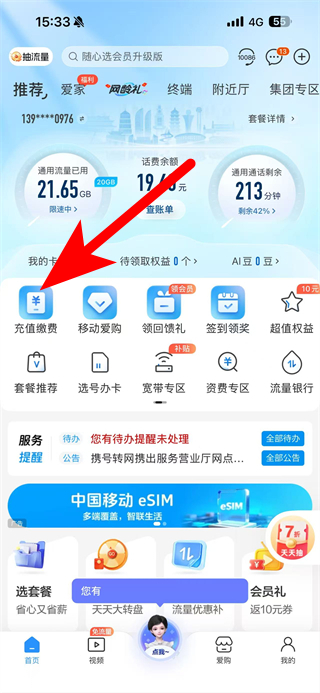 1、打開(kāi)廣東移動(dòng)10086掌上營(yíng)業(yè)廳APP,點(diǎn)擊充值繳費(fèi),進(jìn)入充值中心。