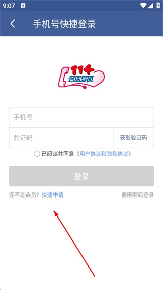 3、在手機號快捷登錄頁面點擊快速申請,進入會員申請頁面。