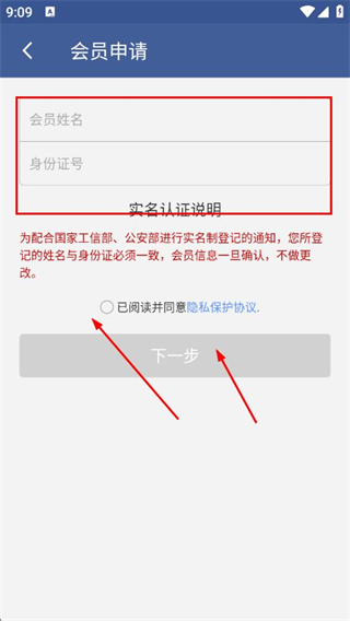 5、在會員申請的實名認證頁面,填寫會員姓名和身份證號,勾選協(xié)議,點擊下一步。