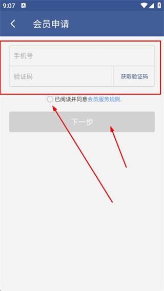 4、在會員申請頁面輸入手機號,點擊獲取驗證碼并填入,勾選服務(wù)規(guī)則,點擊下一步。