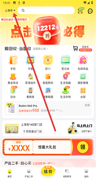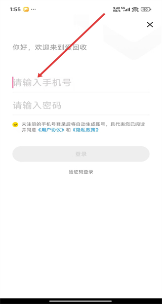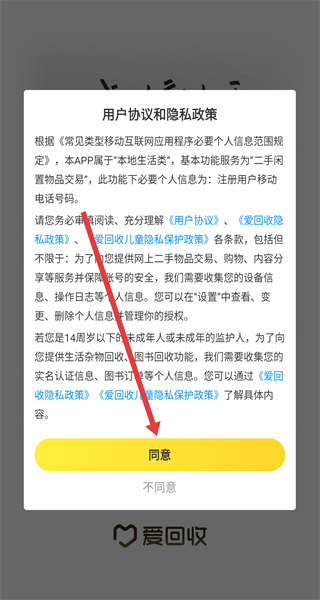 1、點擊“用戶協(xié)議和隱私政策”彈窗的“同意”,進(jìn)入愛回收APP主界面。