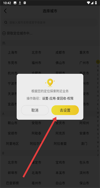 3、在城市選擇頁面點擊“去設(shè)置”,完成定位權(quán)限設(shè)置。