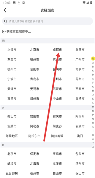 2、在主界面點擊左上角城市選擇按鈕,進(jìn)入城市選擇頁面。