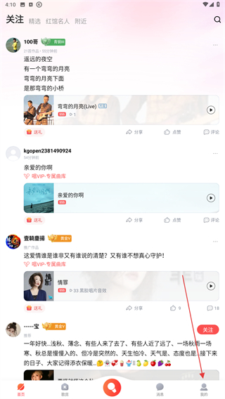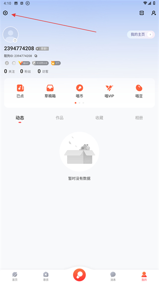 1、打開酷狗唱唱的APP,進(jìn)入首頁點(diǎn)擊右下角我的圖標(biāo)。