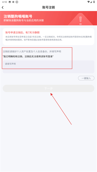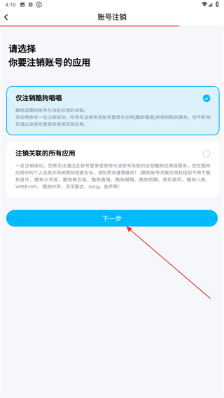 4、進(jìn)入賬號(hào)注銷的頁面內(nèi),勾選僅注銷酷狗唱唱再點(diǎn)擊下一步。