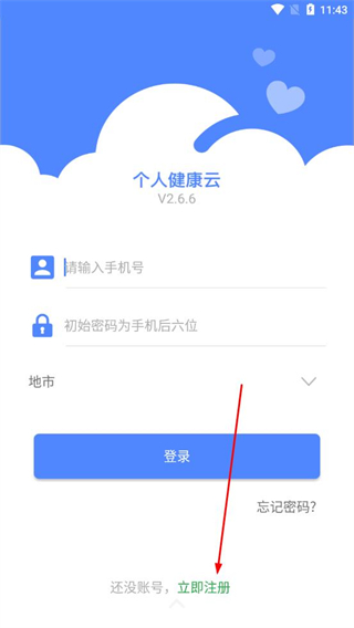 1、打開個人健康云APP,在登錄頁面點擊還沒賬號,立即注冊。