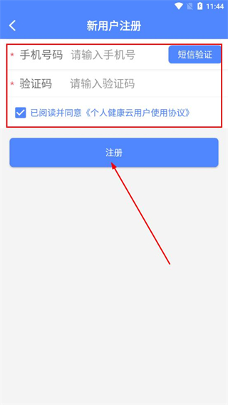 3、在新用戶注冊頁面,輸入手機(jī)號碼,填入驗證碼,勾選協(xié)議,點擊注冊按鈕,完成賬號注冊流程。