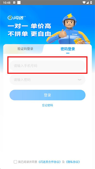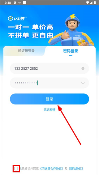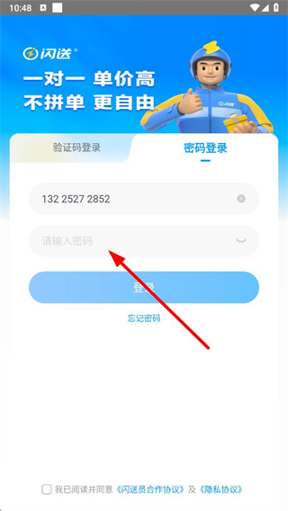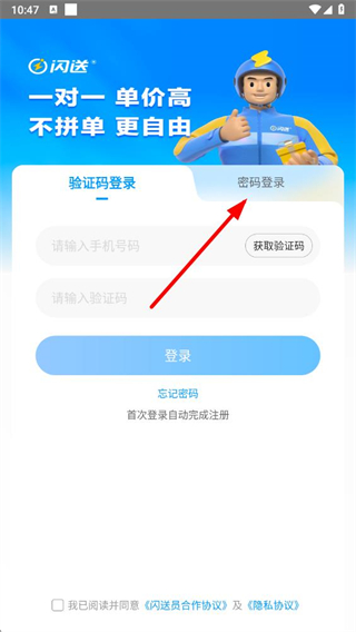 4、勾選我已閱讀并同意閃送員合作協(xié)議及隱私協(xié)議,點擊登錄按鈕,即可完成密碼登錄。