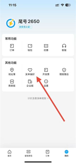 2、在個人頁面點擊發(fā)單偏好選項,進(jìn)入發(fā)單偏好頁面。