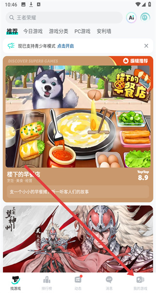 1.首先大家通過本站下載好toptop((taptap)軟件,就可以點(diǎn)進(jìn)去來到首頁,頁面有很多比較熱門的游戲,大家若是嘎感興趣可以直接點(diǎn)進(jìn)去,若是搜索自己喜歡的游戲可以點(diǎn)擊上方搜索框,如下圖所示;