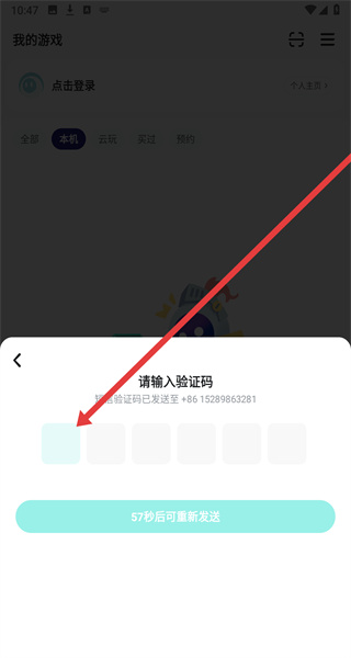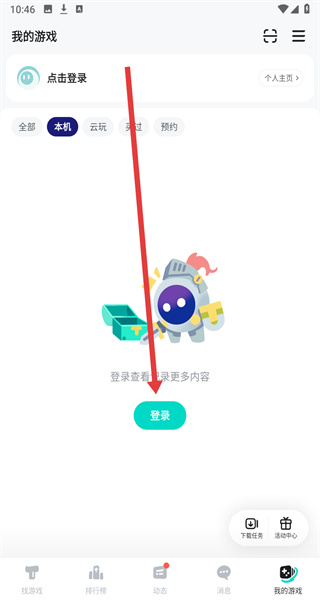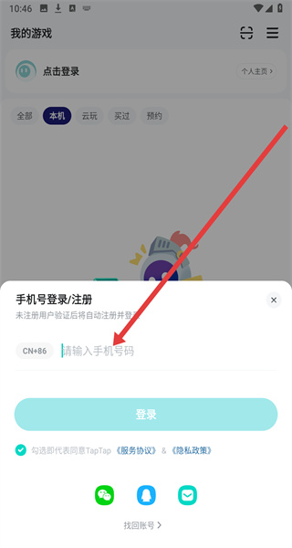 2、在“我的游戲”頁面點(diǎn)擊“登錄”按鈕,進(jìn)入手機(jī)號(hào)登錄/注冊(cè)界面。