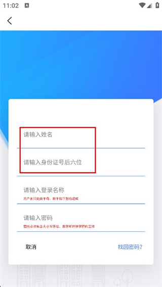 2、進入新用戶認證頁面后,依次輸入姓名、身份證號后六位。