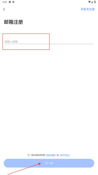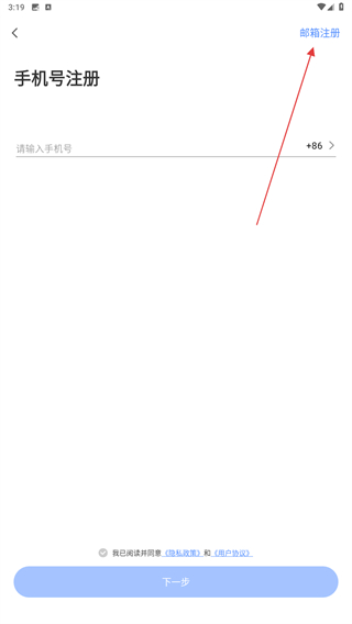 3、進入郵箱注冊的界面內(nèi),輸入郵箱后點擊下一步的按鈕。