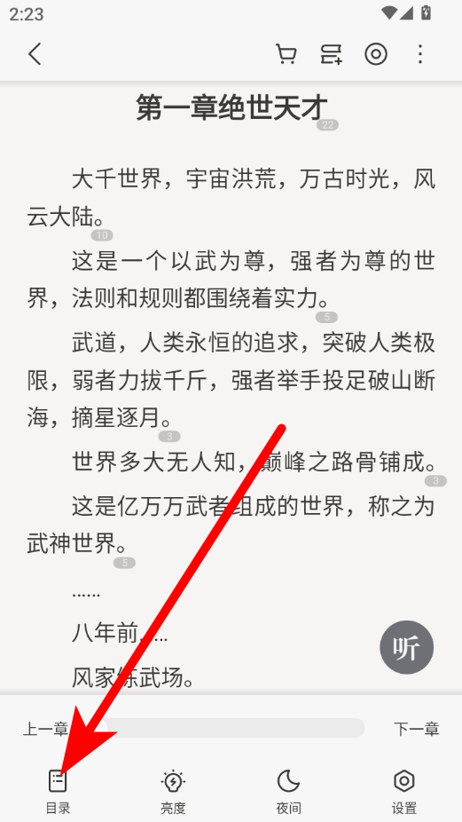 3、在閱讀界面中,點擊屏幕調(diào)出底部菜單,然后點擊左下角目錄選項。