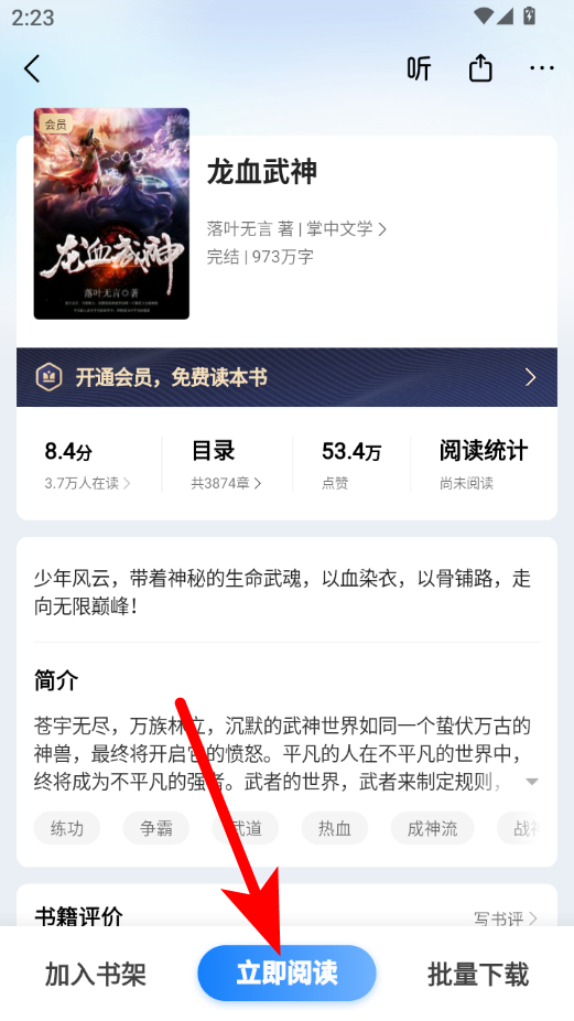 2、在書籍詳情頁,點擊立即閱讀按鈕,進(jìn)入書籍閱讀界面。