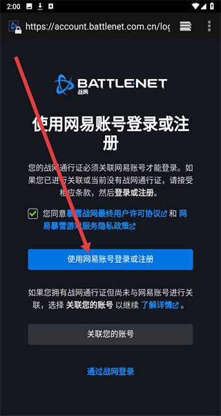 2、在該頁面點(diǎn)擊“使用網(wǎng)易賬號登錄或注冊”,進(jìn)入網(wǎng)易游戲賬號登錄界面。
