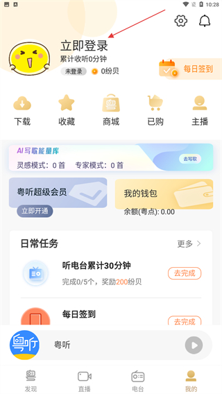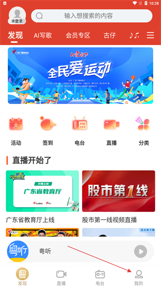 1、打開粵聽app,點擊底部導(dǎo)航欄中的直播選項。