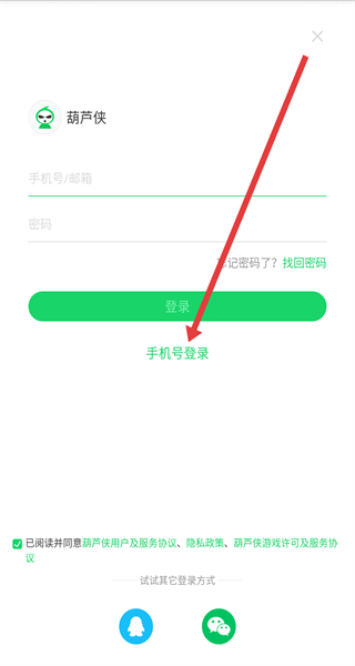 2、在跳轉(zhuǎn)到登錄頁(yè)面中,點(diǎn)擊手機(jī)號(hào)登錄按鈕,切換登錄方式。