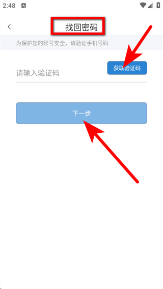 4、在驗(yàn)證碼驗(yàn)證頁面,點(diǎn)擊獲取驗(yàn)證碼按鈕,輸入驗(yàn)證碼后點(diǎn)擊下一步按鈕,即可進(jìn)行密碼找回操作。