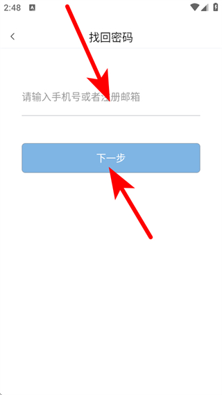 3、在找回密碼頁面,輸入手機(jī)號(hào)或注冊郵箱后點(diǎn)擊下一步按鈕,進(jìn)入驗(yàn)證碼驗(yàn)證頁面。