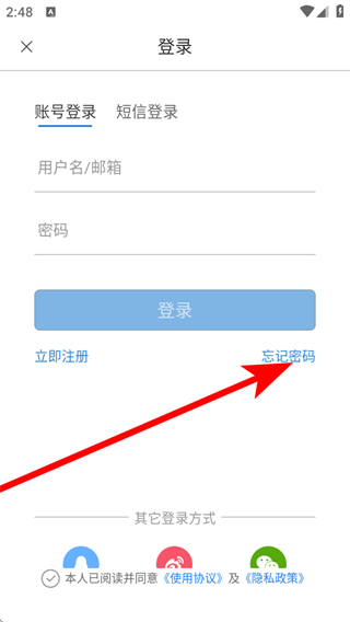 2、在登錄選擇頁面,點(diǎn)擊忘記密碼選項(xiàng),進(jìn)入找回密碼頁面。