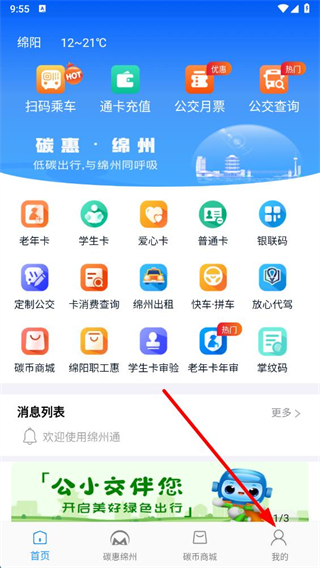 1、在綿州通app首頁(yè)點(diǎn)擊我的選項(xiàng),進(jìn)入個(gè)人頁(yè)面。