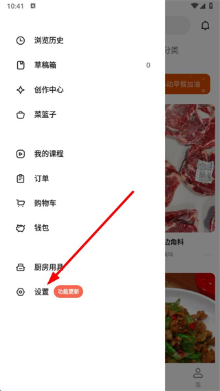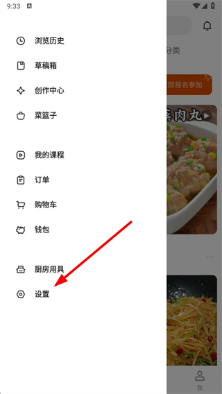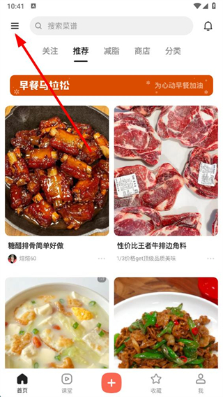 1、在下廚房app首頁點(diǎn)擊左上角的三條橫線菜單圖標(biāo),展開功能菜單。