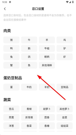 4、在忌口設(shè)置頁面選擇需要忌口的食物類別及具體食材,即可完成忌口食物設(shè)置。