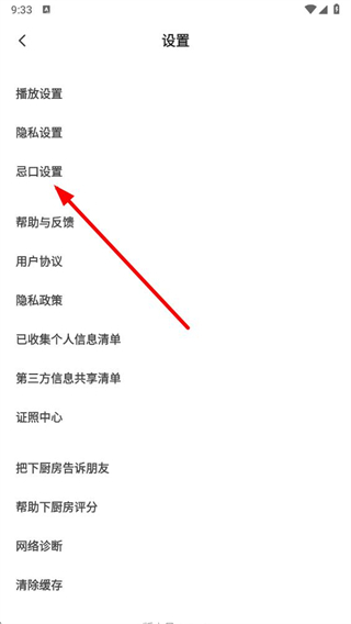 3、在設(shè)置頁面點(diǎn)擊忌口設(shè)置選項(xiàng),進(jìn)入忌口設(shè)置頁面。