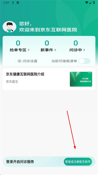 1、打開京東醫(yī)生APP,點(diǎn)擊登錄或注冊(cè)醫(yī)生賬號(hào)。