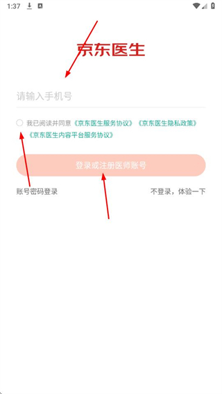 2、輸入手機(jī)號(hào),勾選服務(wù)協(xié)議,點(diǎn)擊登錄或注冊(cè)醫(yī)師賬號(hào)。