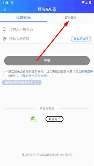 3、進(jìn)入登錄頁面后,點(diǎn)擊密碼登錄選項(xiàng),進(jìn)入密碼登錄頁面。