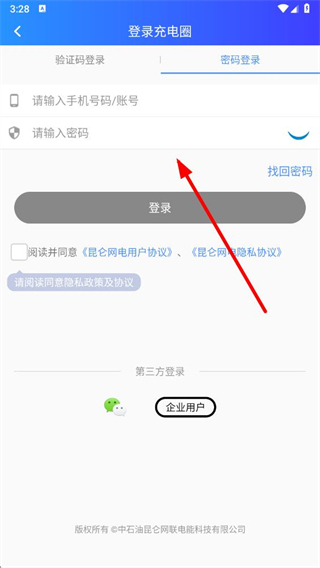 4、在頁面,輸入手機(jī)號(hào)碼或賬號(hào)和密碼,勾選相關(guān)協(xié)議后點(diǎn)擊登錄。