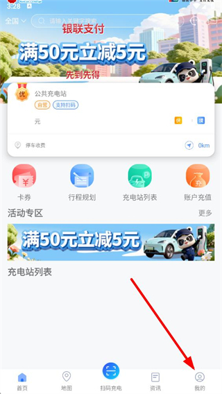 1、打開充電圈app,點(diǎn)擊底部導(dǎo)航欄中的我的選項(xiàng),進(jìn)入個(gè)人頁面。