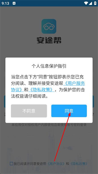 1、打開安途幫app,在彈出的提示框中,點(diǎn)擊同意按鈕。