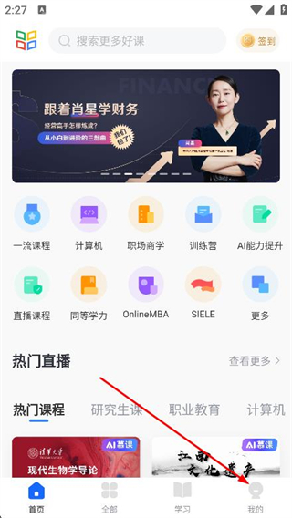 1、打開(kāi)學(xué)堂在線APP,點(diǎn)擊底部導(dǎo)航欄中的我的進(jìn)入個(gè)人頁(yè)面。