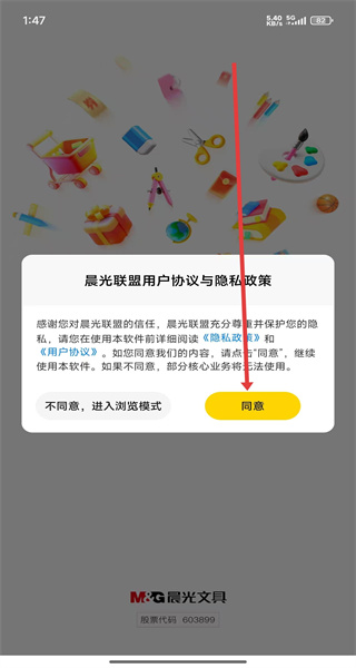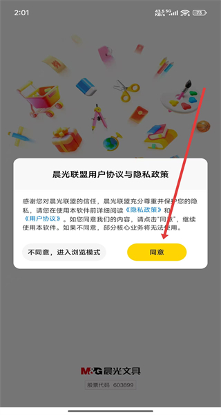 1、點擊“晨光聯(lián)盟用戶協(xié)議與隱私政策”彈窗的“同意”,進入晨光聯(lián)盟主界面。