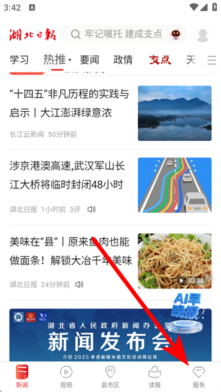 1、打開湖北日?qǐng)?bào)app,需要點(diǎn)擊底部服務(wù),進(jìn)入服務(wù)的頁面。