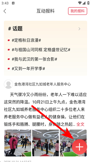 3、在互動(dòng)報(bào)料頁面點(diǎn)擊右下角+號(hào),進(jìn)入報(bào)料編輯的頁面。