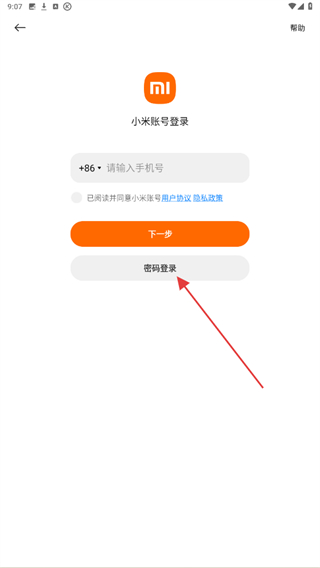 2、在小米賬號(hào)登錄的界面內(nèi),點(diǎn)擊下方密碼登錄的按鈕。
